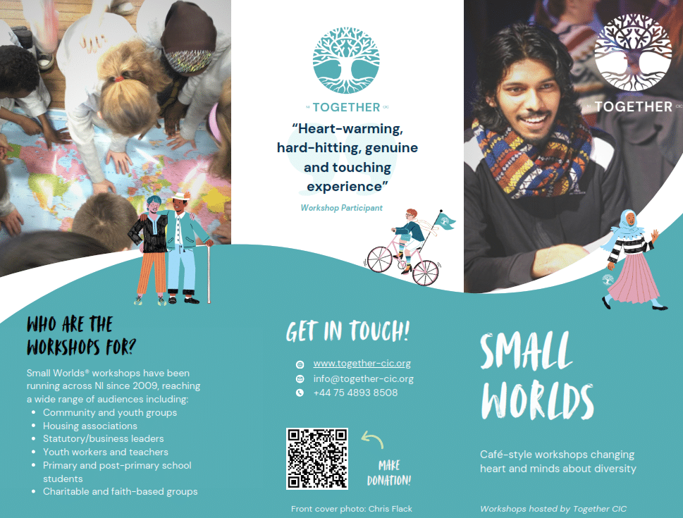 Small groups of 4 to 6 people meet with hosts from different countries for 15 to 20 minutes each. The hosts share their life stories and reasons for coming to NI, and participants can ask questions then move on to another ‘Small World’ to meet the next host.